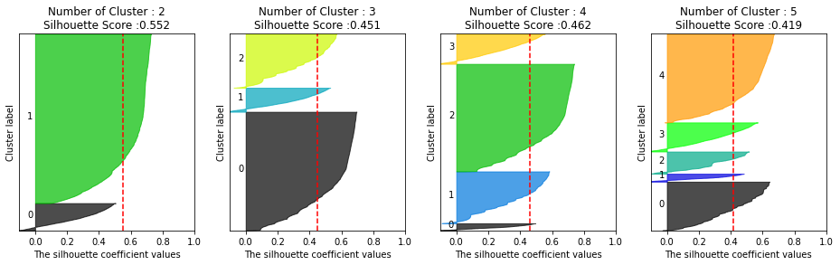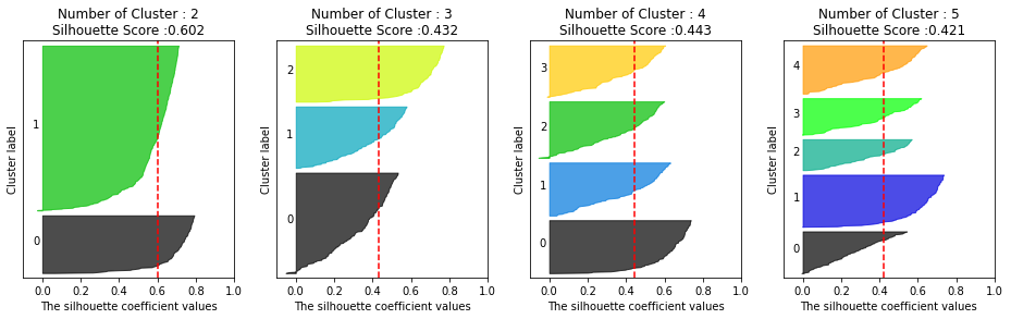 ### 여러개의 클러스터링 갯수를 List로 입력 받아 각각의 실루엣 계수를 면적으로 시각화한 함수 작성 def visualize_silhouette(cluster_lists, X_features): from sklearn.datasets import make_blobs from sklearn.cluster import KMeans from sklearn.metrics import silhouette_samples, silhouette_score import matplotlib.pyplot as plt import matplotlib.cm as cm import math # 입력값으로 클러스터링 갯수들을 리스트로 받아서, 각 갯수별로 클러스터링을 적용하고 실루엣 개수를 구함 n_cols = len(cluster_lists) # plt.subplots()으로 리스트에 기재된 클러스터링 수만큼의 sub figures를 가지는 axs 생성 fig, axs = plt.subplots(figsize=(4*n_cols, 4), nrows=1, ncols=n_cols) # 리스트에 기재된 클러스터링 갯수들을 차례로 iteration 수행하면서 실루엣 개수 시각화 for ind, n_cluster in enumerate(cluster_lists): # KMeans 클러스터링 수행하고, 실루엣 스코어와 개별 데이터의 실루엣 값 계산. clusterer = KMeans(n_clusters = n_cluster, max_iter=500, random_state=0) cluster_labels = clusterer.fit_predict(X_features) sil_avg = silhouette_score(X_features, cluster_labels) sil_values = silhouette_samples(X_features, cluster_labels) y_lower = 10 axs[ind].set_title('Number of Cluster : '+ str(n_cluster)+'\n' \ 'Silhouette Score :' + str(round(sil_avg,3)) ) axs[ind].set_xlabel("The silhouette coefficient values") axs[ind].set_ylabel("Cluster label") axs[ind].set_xlim([-0.1, 1]) axs[ind].set_ylim([0, len(X_features) + (n_cluster + 1) * 10]) axs[ind].set_yticks([]) # Clear the yaxis labels / ticks axs[ind].set_xticks([0, 0.2, 0.4, 0.6, 0.8, 1]) # 클러스터링 갯수별로 fill_betweenx( )형태의 막대 그래프 표현. for i in range(n_cluster): ith_cluster_sil_values = sil_values[cluster_labels==i] ith_cluster_sil_values.sort() size_cluster_i = ith_cluster_sil_values.shape[0] y_upper = y_lower + size_cluster_i color = cm.nipy_spectral(float(i) / n_cluster) axs[ind].fill_betweenx(np.arange(y_lower, y_upper), 0, ith_cluster_sil_values, \ facecolor=color, edgecolor=color, alpha=0.7) axs[ind].text(-0.05, y_lower + 0.5 * size_cluster_i, str(i)) y_lower = y_upper + 10 axs[ind].axvline(x=sil_avg, color="red", linestyle="--")