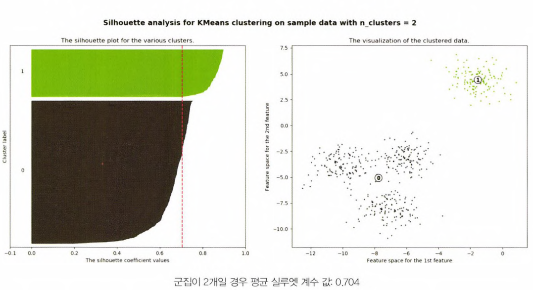 - 왼쪽 그림에서 보듯이 개별 군집의 평균 실루엣 계수 값이 비교적 균일하게 위치하고 있다.