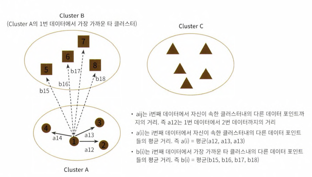 - 군집화가 잘 될수록 개별 군집은 비슷한 정도의 여유공간을 가지고 떨어져 있을 것