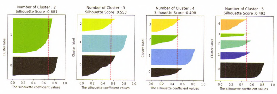 Visualize_silhouette()로 평균 실루엣 계수 값을 시각화하여 군집 개수를 정할 때 사용