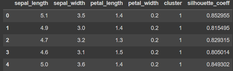- -1에서 1 사이의 값을 가지며, 1로 가까워질수록 근처의 군집과 더 멀리 떨어져있다는 것이고, 0으로 가까워질수록 근처의 군집과 가까워진다는 뜻, -1 값은 아예 다른 군집에 데이터 포인트가 할당되었음을 의미