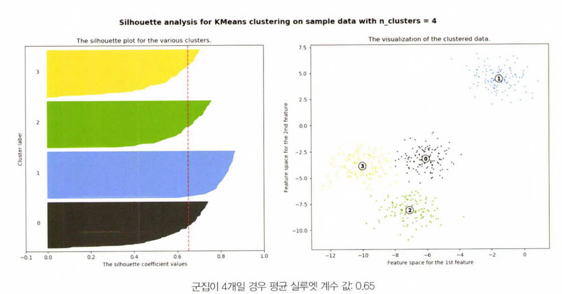 - =>따라서 군집이 2개인 경우보다 평균 실루엣 계수 값은 더 낮지만 4개인경우가 가장 이상적이라 판단 가능