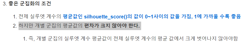 - 즉, 개별 군집의 실루엣 계수 평균값이 전체 실루엣 계수의 평균 값에서 크게 벗어나지 않아야함