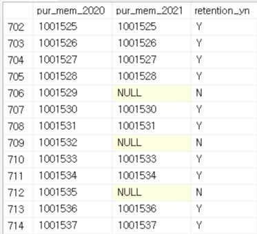 ,CASE WHEN B.mem_no IS NOT NULL THEN 'Y' ELSE 'N' END AS retention_yn