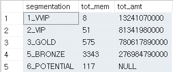 위에서 만든 고객 세분화(segmentation)별 고객 수 및 매출 비중을 보려면