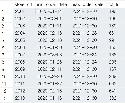 -- 위에서 만든 가테이블을 이용해서 매장코드별 구매주기 구하기