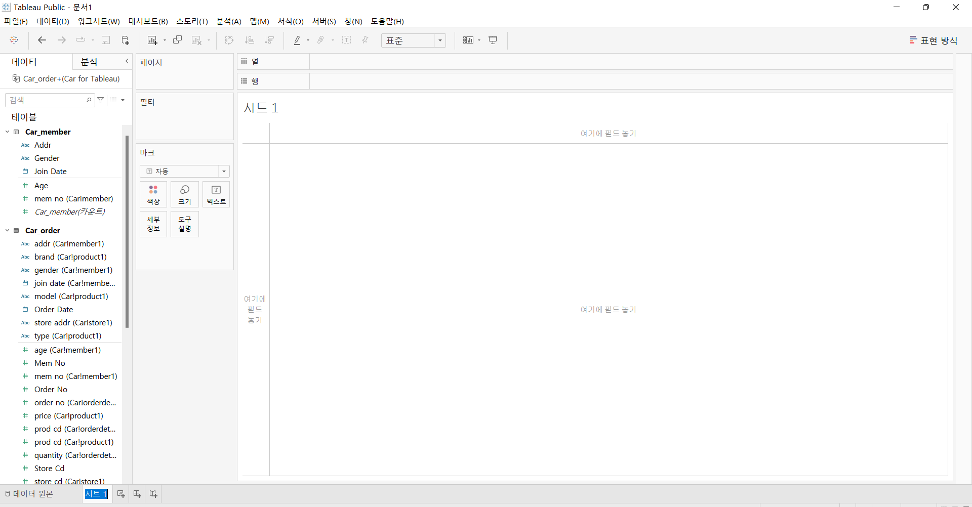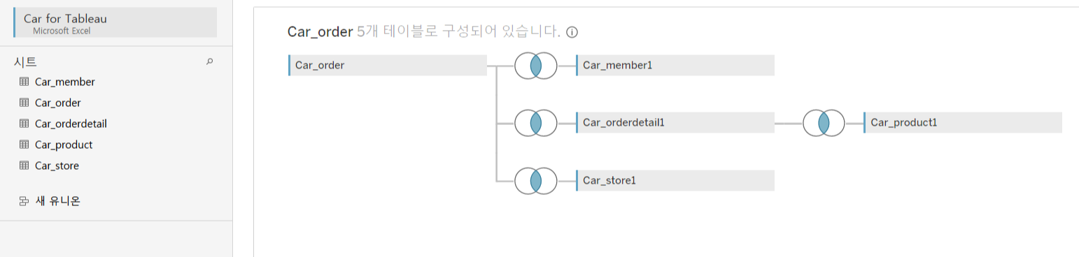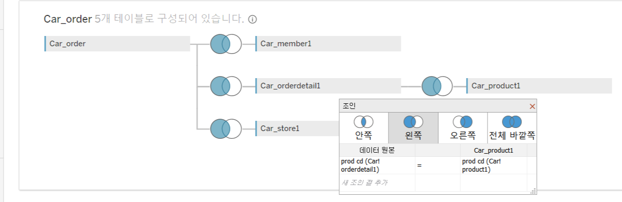 - 캔버스에 테이블을 드래그해서 가져올 수 있는데, 그렇게 할 경우 테이블간의 관계를 만드는 것이고 여기에서는 [Car_Order]을 클릭하고, 더블클릭한 뒤,(조합이나 유니온을 추가하려면 테이블을 더블클릭하면 된다) [Car_member] → [Car_orderdetail] → [Car_product] → Car_store] 순으로 클릭하면 자동으로 테이블 간의 공통값을 기준으로 결합(JOIN) 된다.
