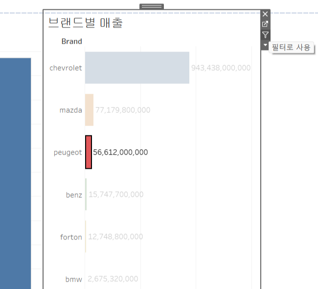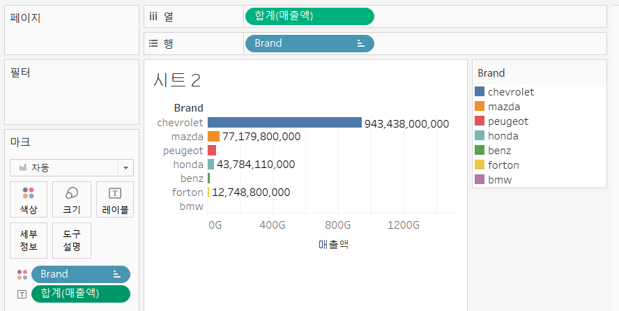 - 마크카드(색상 및 레이블)에 [Brand] 및 [매출액] 필드를 Ctrl누른 상태에서 드래그하기