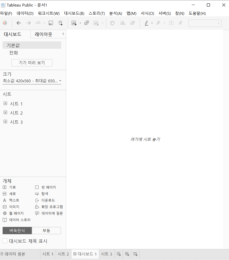 * 태블로 대시보드는 워크시트를 추가하기 전 가로 및 세로 개체로 툴을 만들어 놓아야 한다. 이러한 틀을 미리 만들어 놓지 않으면 워크시트가 많아질수록 대시보드를 구성하기 어렵다.