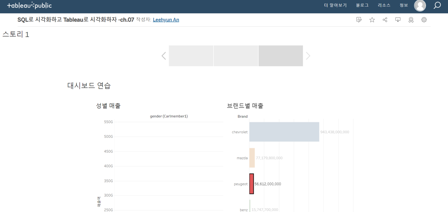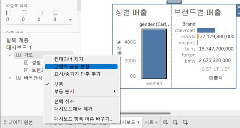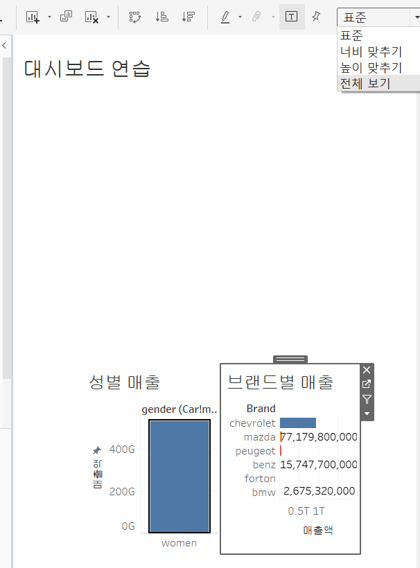- [성별 매출액], [브랜드별 매출액], [대시보드1]을 더블 클릭