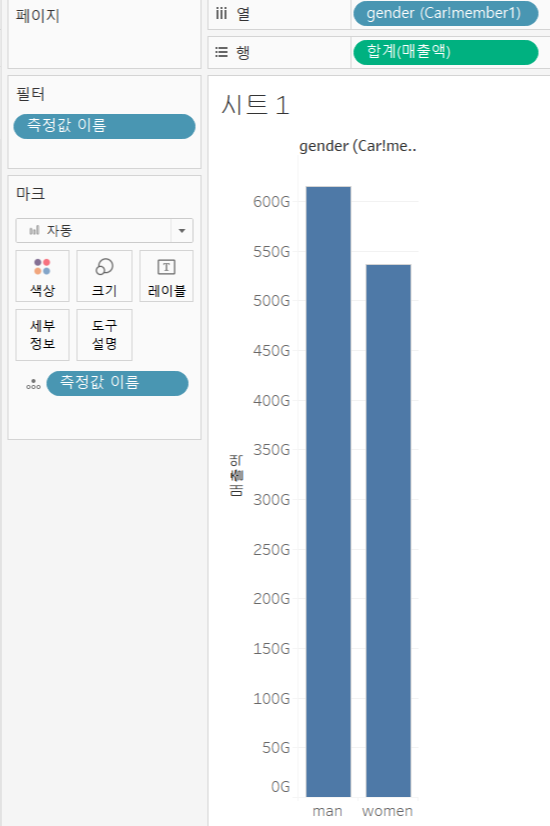 - 뷰 위쪽 → 행과 열 : 사이드바(B)의 데이터 패널 값을 추가하여 시각화