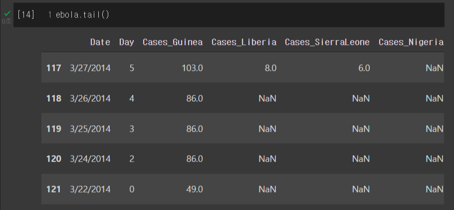 print(ebola.iloc[-5:,:5]) #뒤쪽 데이터 nan 존재