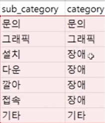- 여기서는 '질문', '그래픽', '설치', '다운', '깔아', '접속', '설치다운깔아접속', sub_category, category 열 만들기