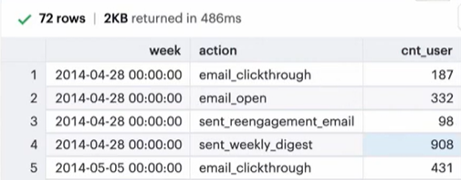 - user_id / occurred_at / action (email_open, email_clickthrough etc ..)