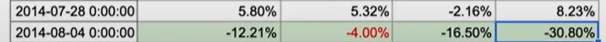 - 시점별로 engagement 수가 테이블에 나와있는데, 이러한 값을 "전 주 대비 몇%증가" 로 엑셀 표등을 활용하여 표현해보면 한 눈에 비교할 수 있다. (아래 표)
