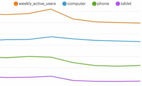 - 이런 추이 그래프를 비교할 때 주의해야할 점은, 예를 들어 여기에서는 전체 WAU와 phone은 트래픽 수가 비슷하여 비교할만 하지만, tablet의 경우 트래픽 수가 많지 않아서 단독으로 볼 때에는 engagement drop이 확실히 눈에 보이지만, 전체 그래프를 같이 볼 경우 매우 완만해서 잘 보이지 않으므로 주의해야 한다.