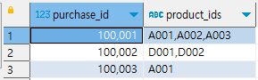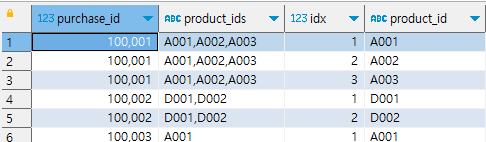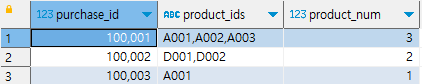 cross join unnest(string_to_array(product_ids, ',')) as product_id;