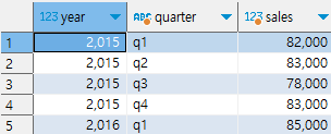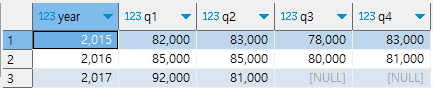 위처럼 컬럼으로 표현된 가로 기반 데이터의 특징은 데이터의 수가 고정되어 있다는 것 (q1~q4 4가지 데이터로 구성)