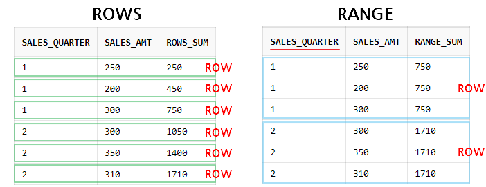 오라클에서 OVER 절에 WINDOWING 절을 처음 사용할 때 ROWS와 RANGE가 어떤 차이점이 있는지 많이 헷갈릴 수 있다. 간단히 설명하면 ROWS는 각 행의 위치고, RANGE는 값의 범위라고 생각하면 된다. 아래의