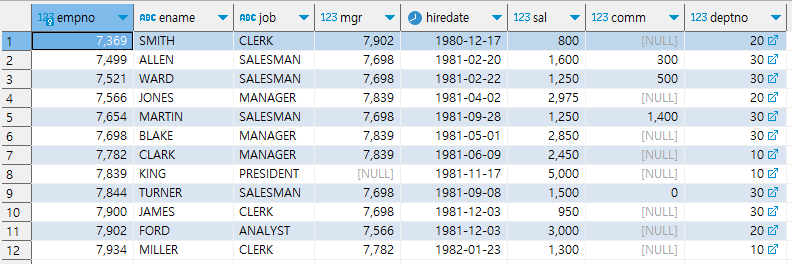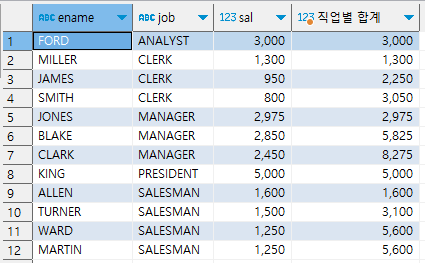 → unbounded following이었을 때에는, clerk의 직업별 합계 값이 모두 동일하게 job 별로 집계되어 3,050이었던 반면, current row까지로 입력한 결과 직업별 합계가 current row까지 job 별로 집계된 모습