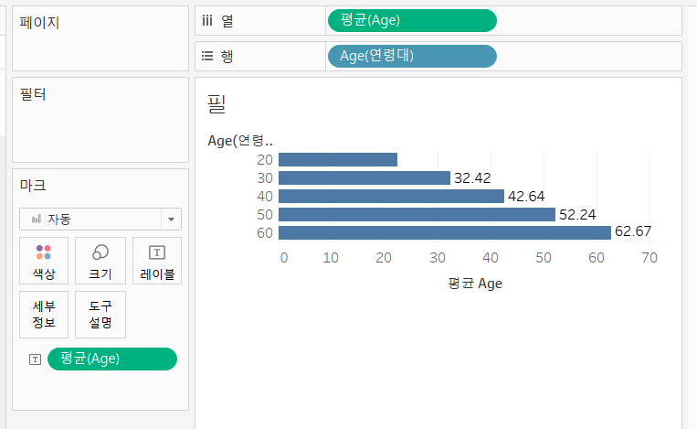 - Age를 마크카드의 레이블에 드래그하여 똑같이 평균으로 바꿔주고, 평균 값이 그래프 옆에 뜨도록 한다.