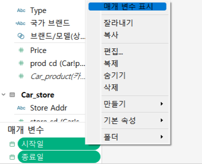 - 사이드바 상단(▼) 클릭 후, [시작일] 및 [종료일] 매개 변수 필드를 생성한다.