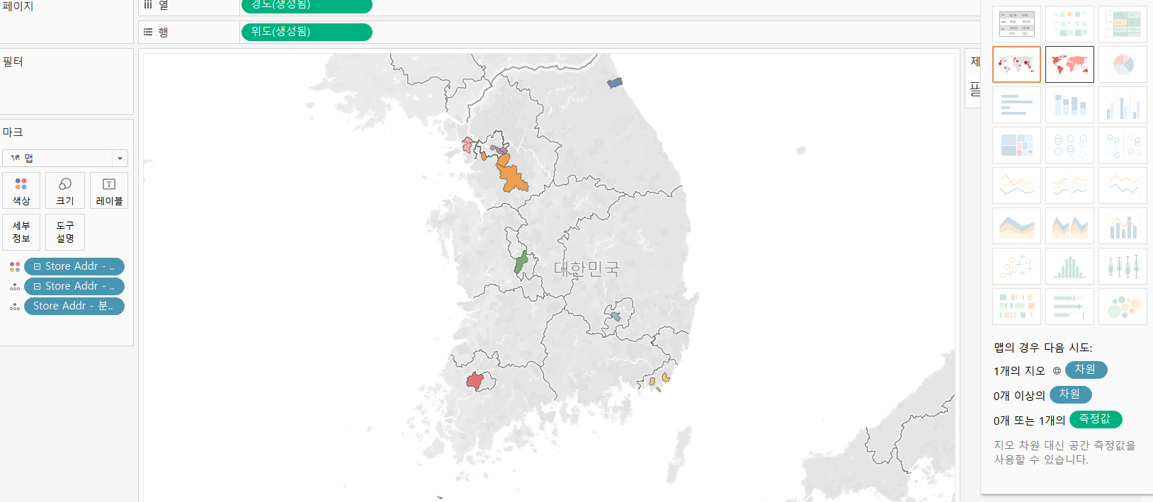- 마크카드 - '색상'과 '세부정보'에 Store Addr 계층을 드래그한다.