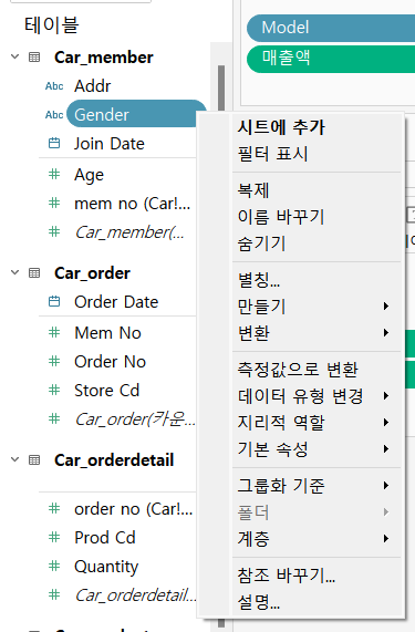 - Model 필드를 행에 드래그하고, 우클릭 하여 측정값으로 변환하기