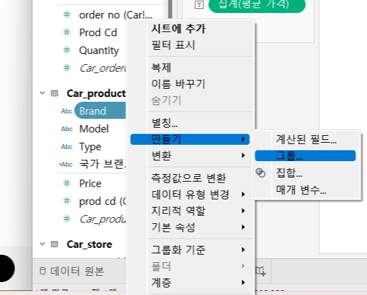 - 열에 집계(평균 가격)을, 행에 합계(매출액)을 드래그한다.