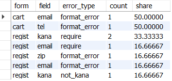 입력 양식 중 오류가 발생했을 때 페이지 열람 로그에 error라는 상태를 출력하는 로그 데이터(form_log)로 오류율을 집계