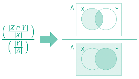 ex. 100개 구매로그에서 상품X를 구매하는 로그가 50개, X와 Y를 모두 구매하는 로그가 20개, Y만 구매하는 로그가 20개라면, 신뢰도는 20/50 = 40%, Y의 구매확률은 20/100 = 20%, 리프트는 40%/20% = 2.0이 된다.