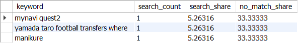 100.0 * search_count / SUM(search_count) OVER() AS no_match_share