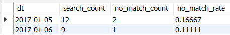 AVG(CASE WHEN result_num = 0 THEN 1.0 ELSE 0.0 END) AS no_match_rate
