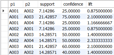 -> <상품 p1을 구매한 사람이 상품 p2도 구매한다.> 라는 상관 규칙에 관한 지지도, 확신도, 리프트 확인