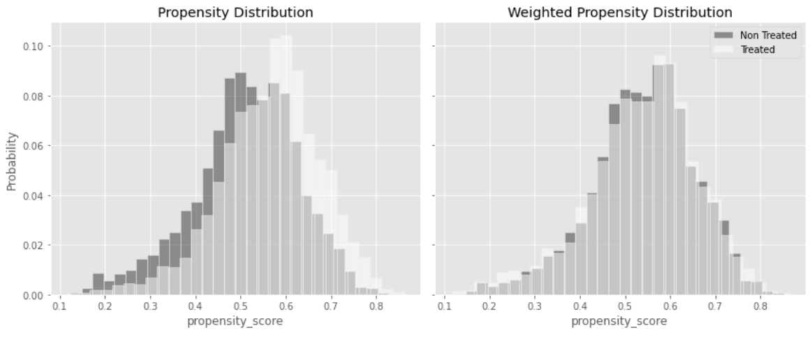 * 중간(회색)부분에서 두 분포가 겹치게 되고, 이는 가중치가 적용된 데이터에서 처치를 받을(받지 않을) 확률이 동일해짐을 의미