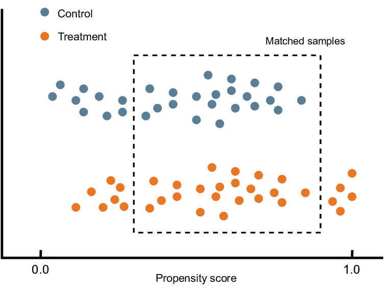 - 성향 점수가 동일하다면,(=관리자가 교육(처치)을 받을 확률이 똑같다면), 처치는 사실상 무작위 배정된 것과 같다.