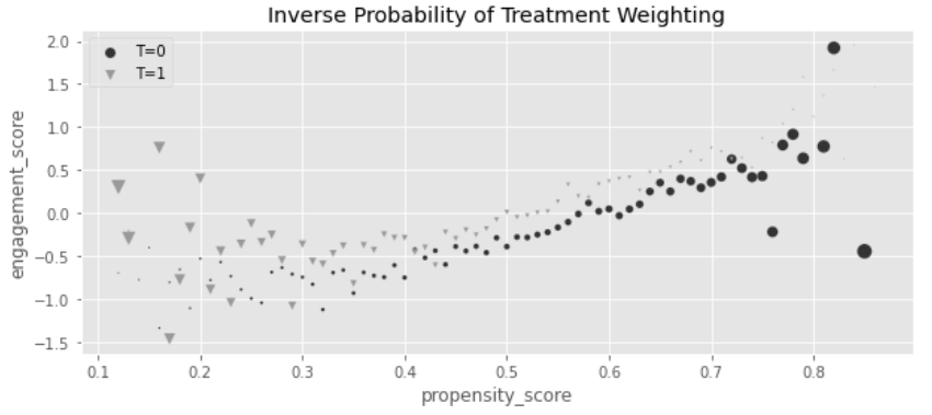 좌측 그래프를 보면 앞서 언급한 것처럼, e(x)가 낮은 영역에서 대조군이 분포가 높기에, 실험군의 가중치가 증가한다.