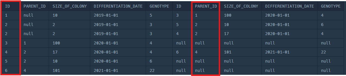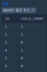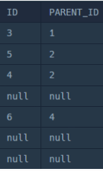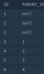 → ID는 1~6 모두 존재했지만, PARNET_ID는 1,2,4으로 3개이기에 부모 기준이니까 나머지에 해당하는(부모가 없는) ID는 null로 나옴