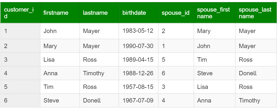 customer_id를 기준으로 작성된 테이블에서, customer_id에 매핑된 spouse_id 배우자의 성과 이름을 보고자 한다.