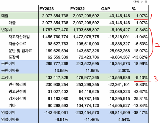 - 변동비 (▼-0.34%) - 대부분 역성장, 운반 및 임차료가 증가한 건 물류센터 관련 이슈로 판단됨
