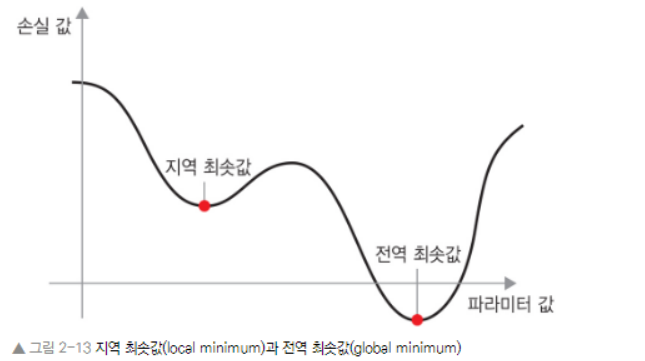 - 위 그림을 보면, 어떤 파라미터 값에서는 지역 최솟값에 도달하고, 그 지점에서는 왼쪽으로 이동해도, 오른쪽으로 이동해도 손실이 증가하게 된다. 대상 파라미터가 작은 학습률을 가진 SGD로 최적화되었다면 최적화 과정이 전역 최솟값으로 향하지 못하고, 지역 최솟값에 갇히게 될 것