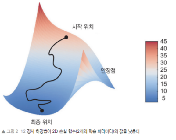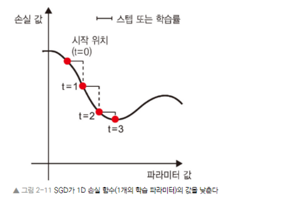 - 위의 그림은 1D 파라미터 공간에서 경사 하강법을 설명하고 있지만, 실제로는 매우 고차원 공간에서 경사 하강법을 사용하게되며, 신경망에 있는 각각 가중치 값은 이 공간에서 하나의 독립된 차원이고 수만개가 될 수 있다.