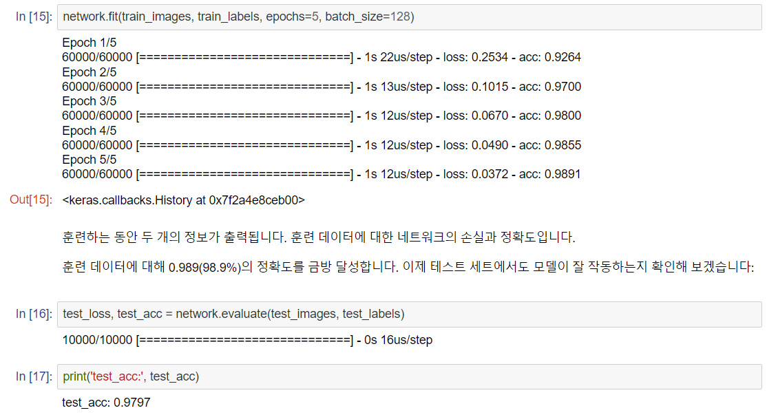 - fit 메소드 호출시, 네트워크가 128개 샘플씩 미니 배치로 훈련 데이터를 5번 반복한다. ( 각 반복을 에포크epoch라 함)