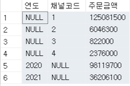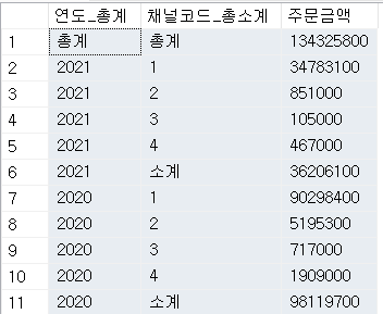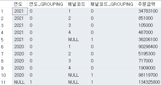 - GROUPING 및 CASE WHEN을 활용하면, NULL이 아닌 '총계 및 소계' 로 표기할 수 있다. 다만, 여기서 GROUP BY 항목인 연도 및 채널코드 열의 형식이 숫자이므로 '총계 및 소계'와 같은 문자형으로 표기할 수 없음