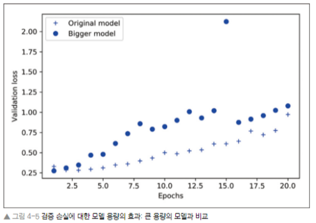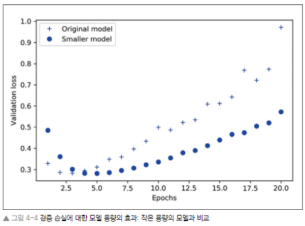 - 과소적합과 과대 적합 사이, 즉 과소용량과 과대용량의 경계에 적절히 위치한 모델이 이상적이며, 이 경계가 어디에 위치하는지 찾기위해서는 먼저 지나쳐 보아야 한다.