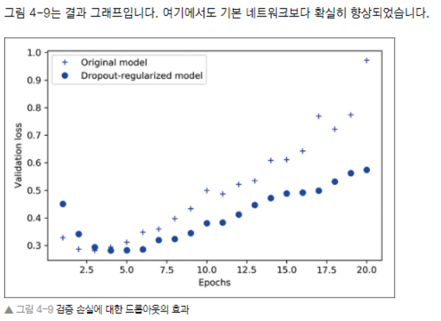 - 케라스에서는 층의 출력 바로 뒤에 Dropout 층을 추가하여 네트워크에 드롭아웃을 적용할 수 있다.