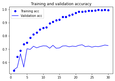 - 이 그래프는 과대적합의 특성을 보여준다. Training acc는 시간이 지남에 따라 선형적으로 증가해서 거의 100%에 도달하는 반면, Validation acc는 70-72%에서 멈추었다.