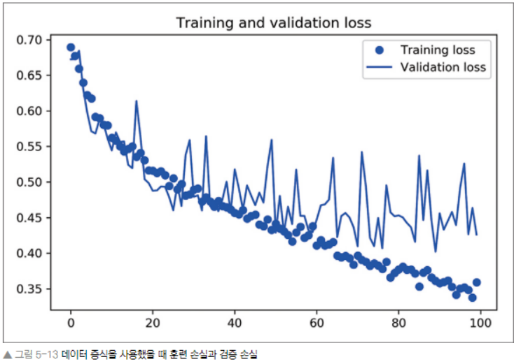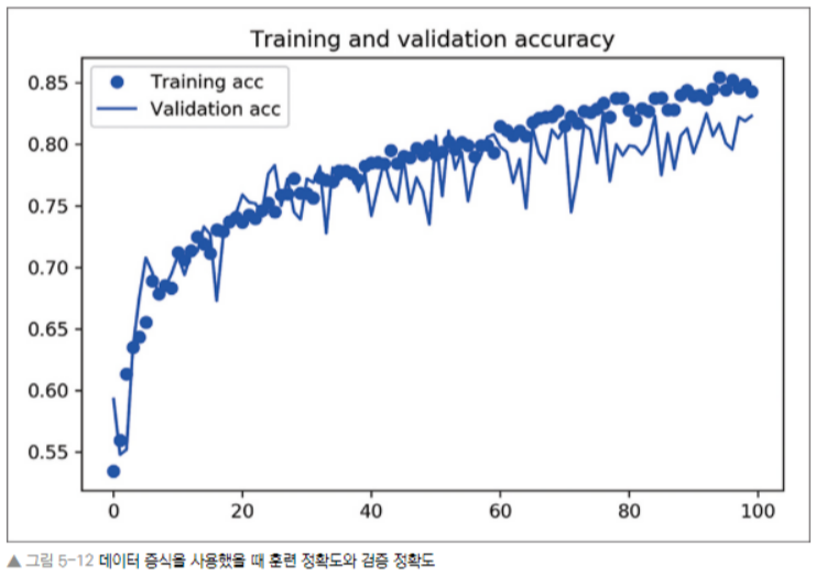 - 데이터 증식과 드롭아웃 덕분에 더이상 과대적합되지 않고 있다. (훈련 곡선이 검증 곡선에 가깝게 가고 있다.)